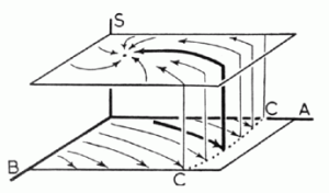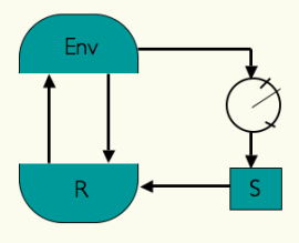 In the 1950’s British cybernetician W. Ross Ashby introduced the concept of an ultrastable system in his book Design for a Brain. If an organism needs to keep certain essential variables within bounds (e.g., blood temperature, pH) then a system that triggered internal parametrical changes whenever such variables approach or cross a boundary of viability would, in principle, have a chance of finding new parameters that make the challenged variables return to their viability zones. In the scheme on the left, the organism is represented in interaction with the environment: R represents the