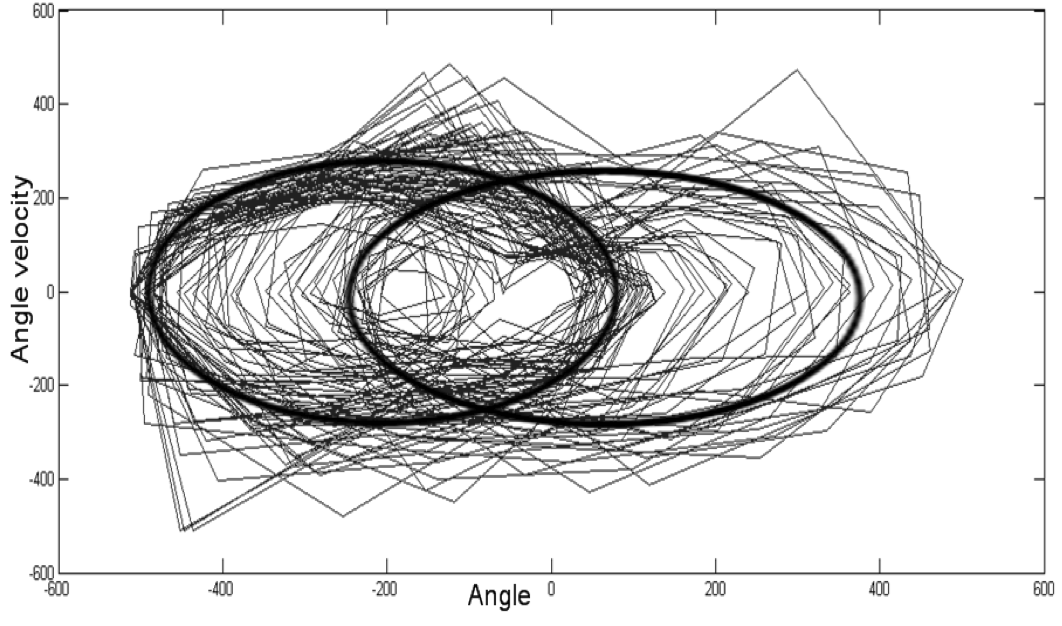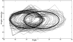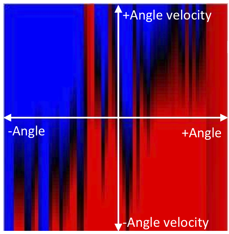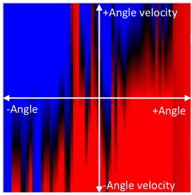 We investigate this idea using a simple see-saw actuated system whose essential variable is the angle of the see-saw. We have modified important aspects of Ashby’s theory, transforming ultrastability into a local adaptation process. A way to move gradually towards an objective is by making sure at every step that there is as little deviation as possible while adapting to obstacles. The phase space on the left indicates force (red-blue gradient) as a function of angle and angular velocity for a successful “self-developed” profile. This approach has inspired us to model a local strategy to eventually attain viability (equilibrium) in a real complex dynamical system, amidst perturbations, using ultrastability to make sure that the path to viability itself is viable.