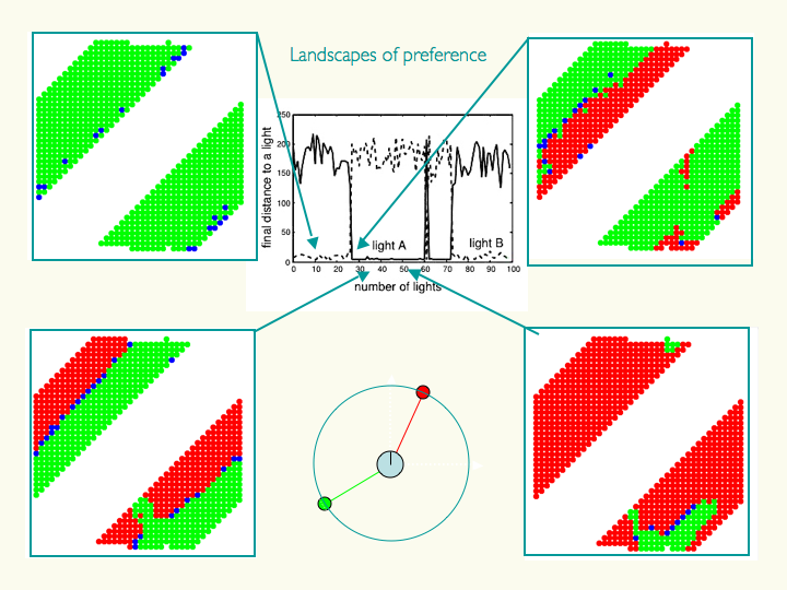 Below: A study of “virtual” choices (what the agent might have done at a given time had the environment been different – in this case, the relative angular orientation of two light sources emitting different coloured light). Plots show the agent’s end target of approach depending on the angular orientation of each light (horizontal and vertical axes in each sub-plot) as a function of time over a presentation of 100 pairs of lights. At different points in time the agent shows the alternation between periods of “high commitment” to a goal (one colour is prevalent; agent practically ignores the other option) and periods of environmentally susceptible choice (both choices are highly represented).