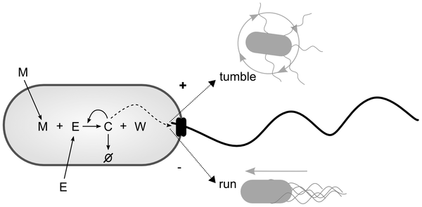 Left: Diagram indicating the minimal metabolic reaction and its coupling to tumbling and running modes of behaviour. A simple metabolism consumes resources M and E, which are then engaged in the autocatalytic production of C (a metabolic product) and W (waste). The concentration of C gives an indication of the “health” of the bacterium and is used to modulate the probability of switching between the running and tumbling modes.