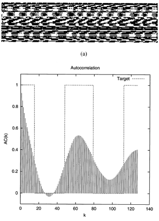 Above left: evolved ARBN with N = 32, K = 2, and a target period P = 64: network state for 1000 time steps and evolved autocorrelation. The dashed line shows the target autocorrelation used by the evolutionary algorithm. For a network with N = 64, K = 2 and P = 32
